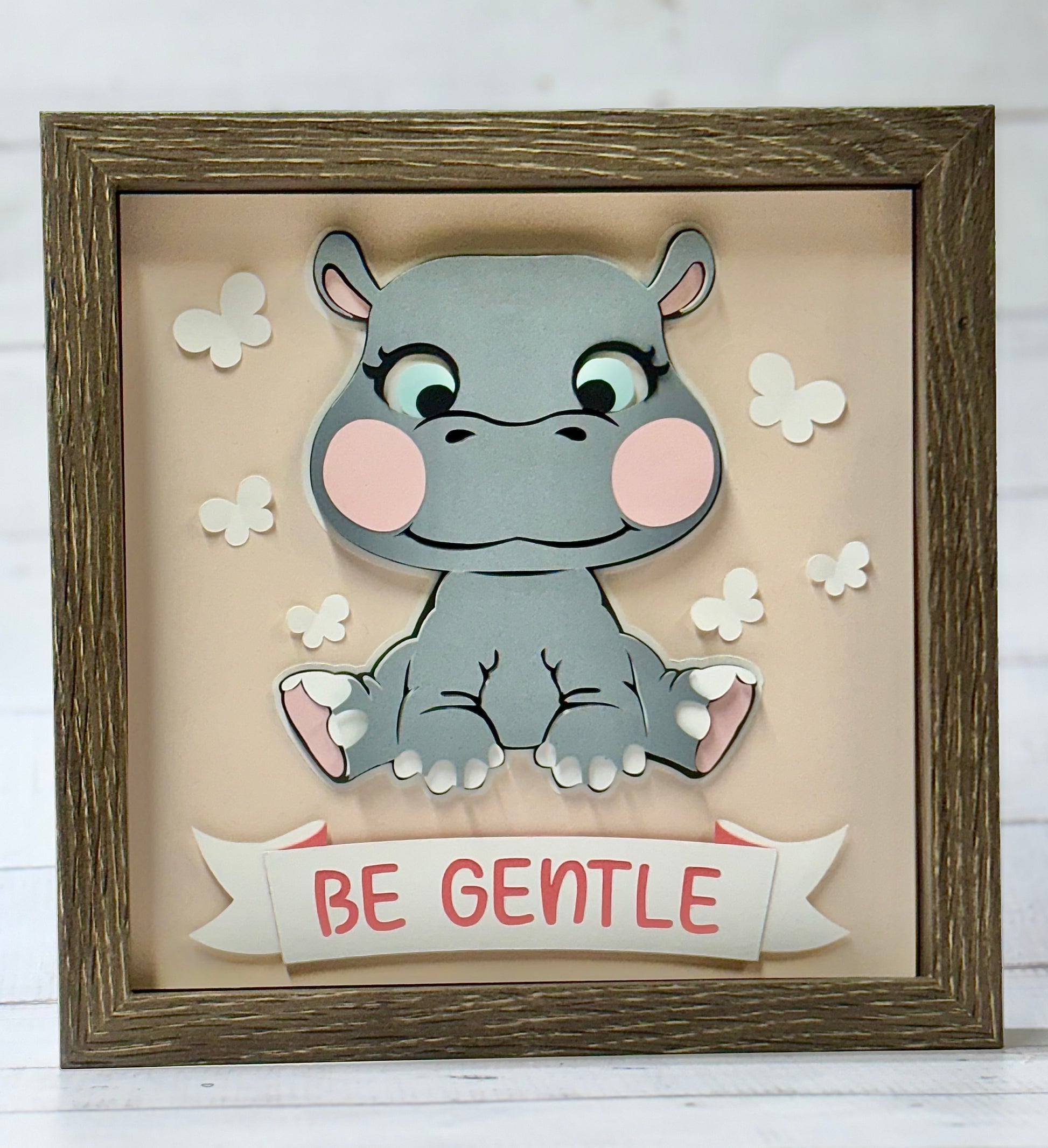 This shadow box features a cute cartoon baby hippo, with the positive message "Be Gentle" below. A perfect addition to a nursery or child's room, this shadow box reminds kids to be kind and gentle with others.