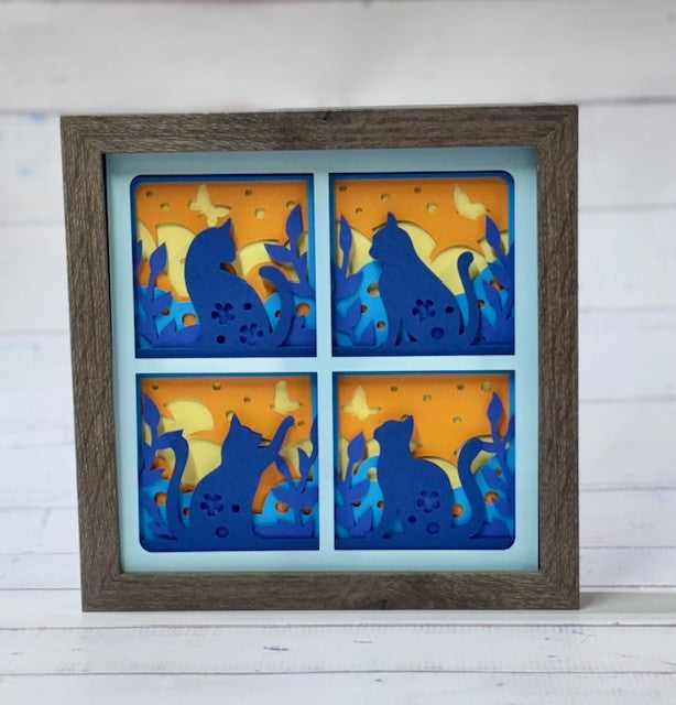 A charming shadow box featuring a window-style frame that showcases cat and butterfly silhouettes. This single piece brings together the grace of felines and the delicacy of butterflies in one cohesive display. Ideal for cat lovers and nature enthusiasts seeking understated, meaningful wall art.