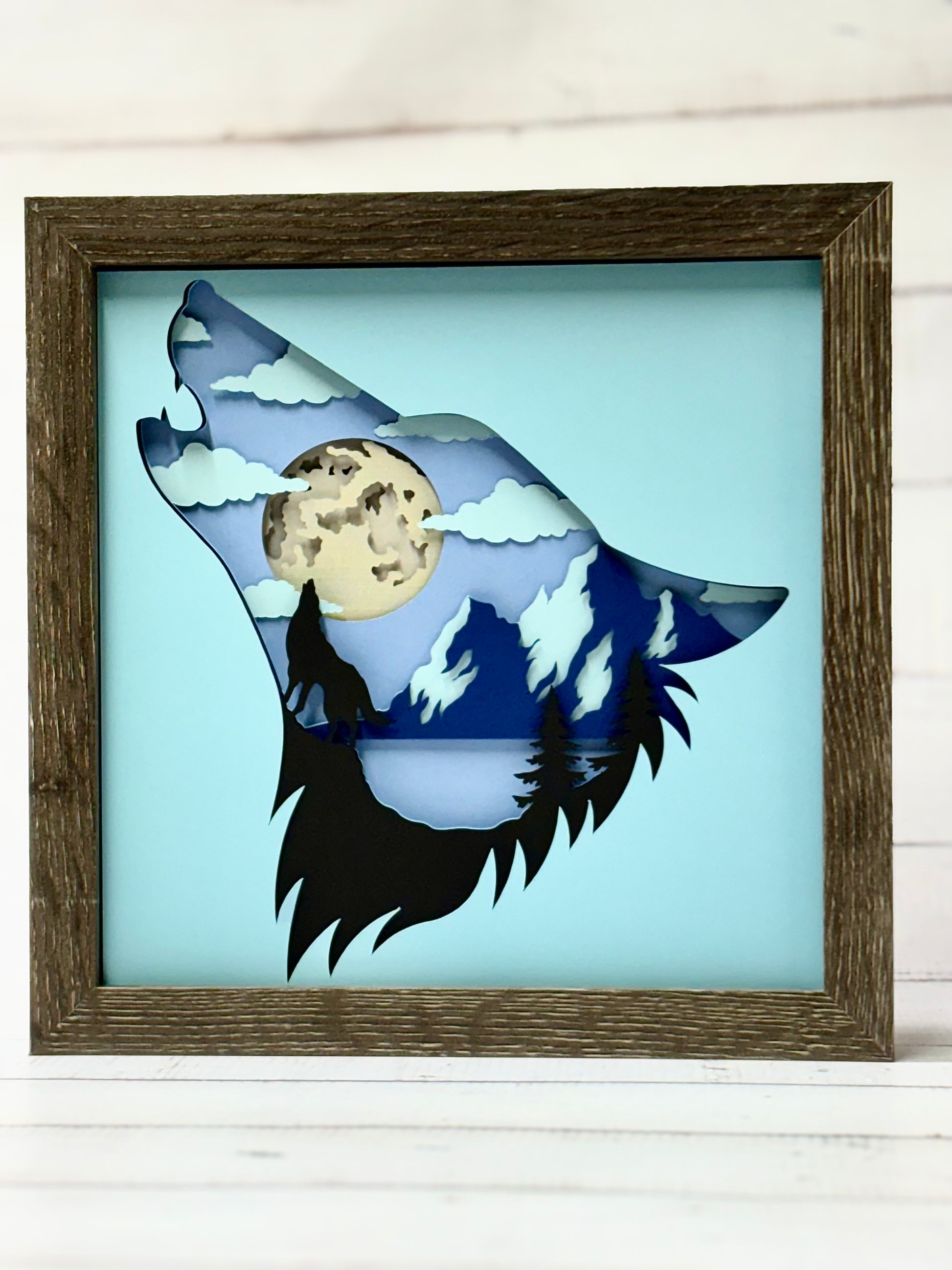 This shadow box features a majestic wolf howling to the moon, creating a stunning addition to any decor. The elegant design adds a touch of nature and wilderness to your home. Crafted with high-quality materials, it is a unique and eye-catching piece that will elevate any space.