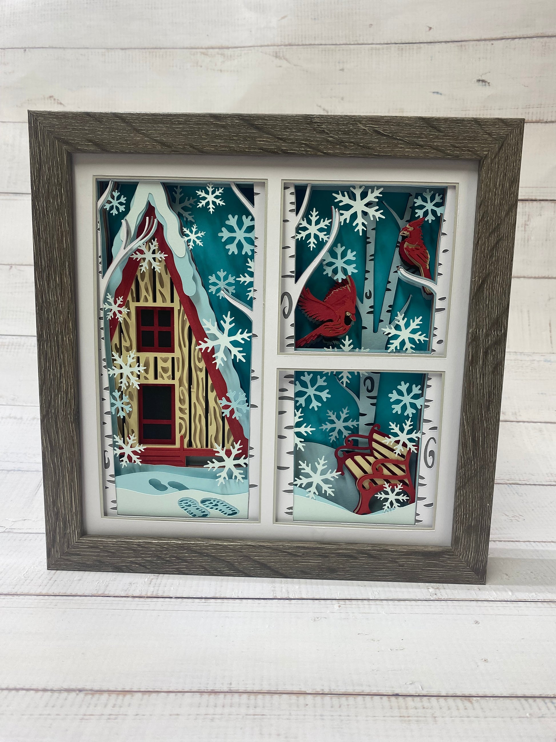 Experience the beauty of winter with our Winter Cabin Shadow Box. Featuring a charming cabin surrounded by birch trees and cardinals, this cozy piece adds a touch of nature to any home. Bring the outside in and create a warm and inviting atmosphere with this unique and detailed shadow box.